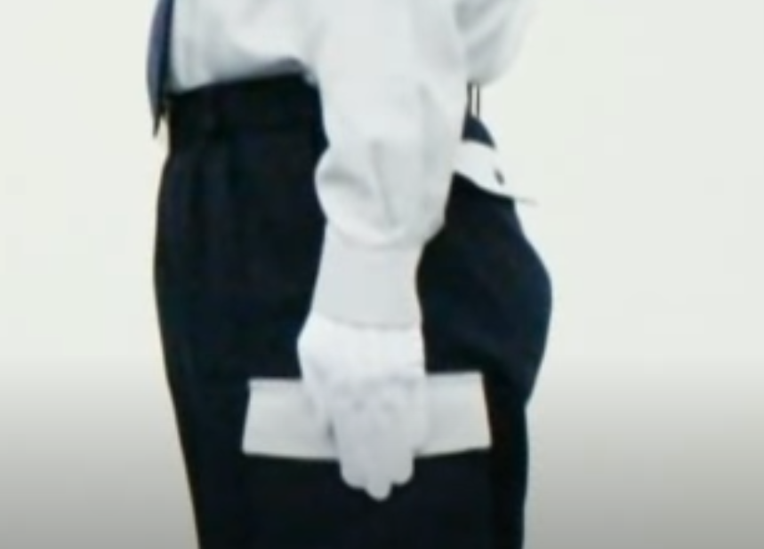 同時に手は後でズボンのベルト中央に重ねて組みます。この際、手のひらは後ろに向けて開き、左手の親指と四指で右手の甲と四指を軽く握り、両親指を交差させます。