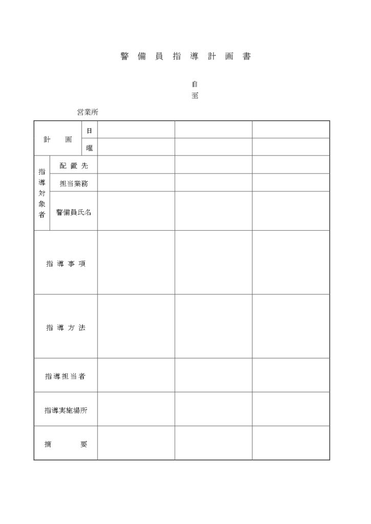 指導計画書には定められた書式というのはありませんが、警備業協会が指導する書式というものがありますのでその書式をここではご紹介させていただきます。