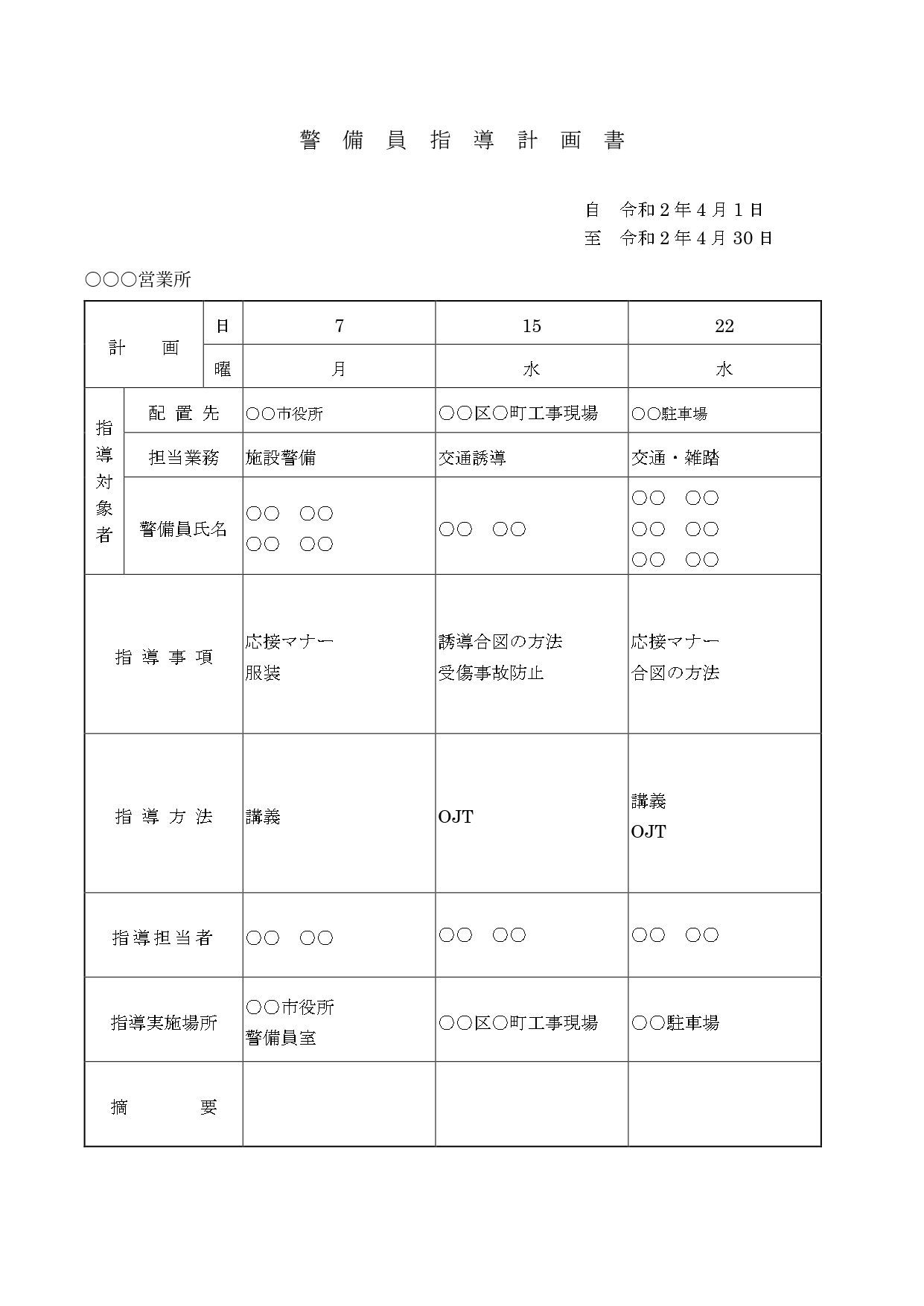 - 指導対象者・・・配置先、担当業務、警備員氏名を記載してください。