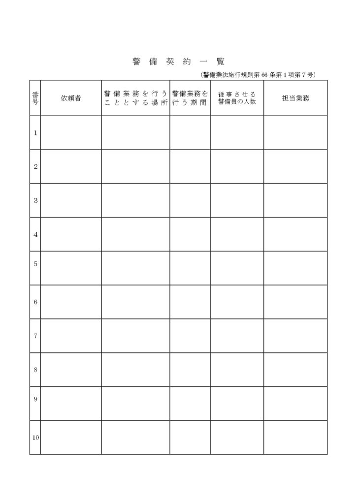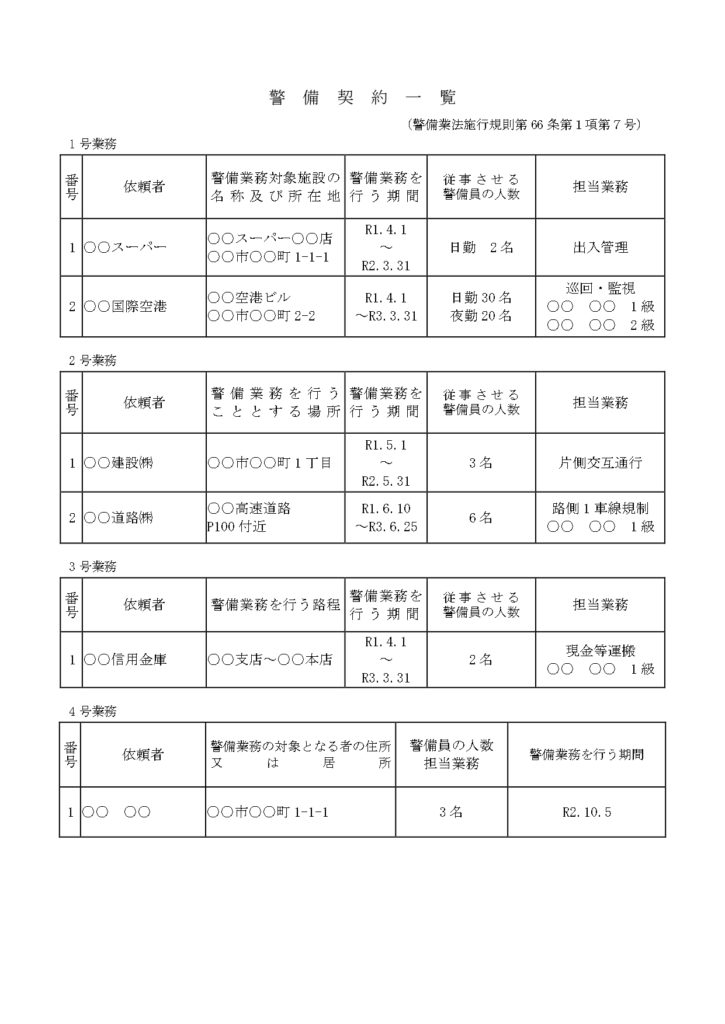 警備契約一覧への記載例を紹介しておきますので、参考にしてください。