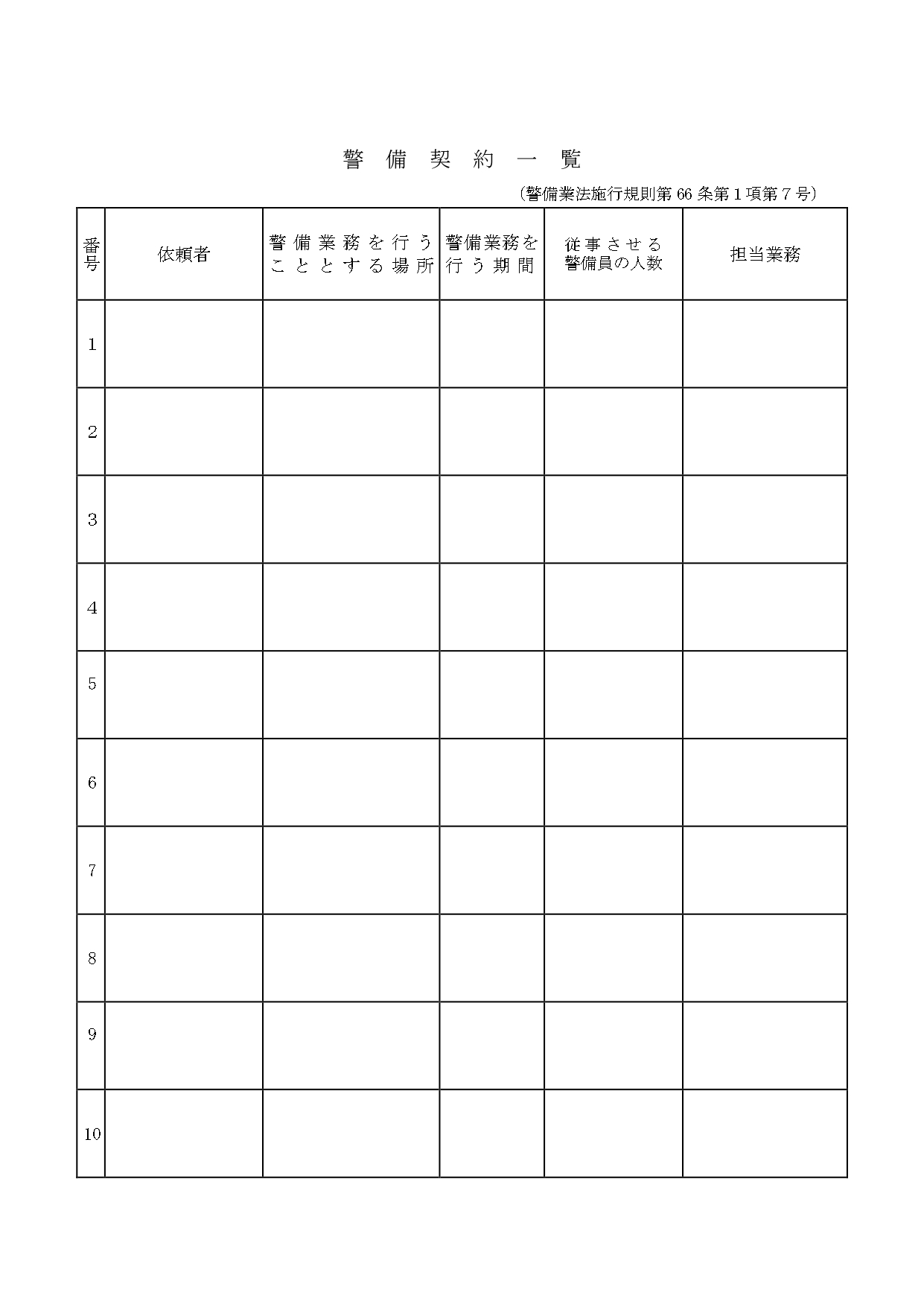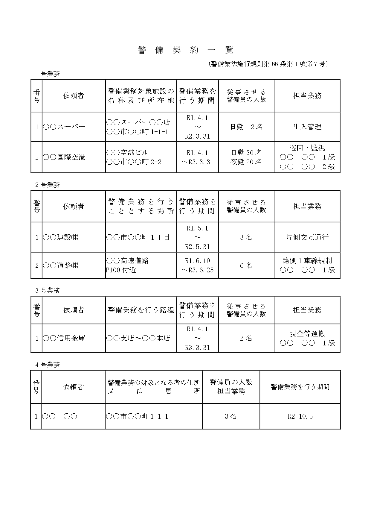 警備契約一覧への記載例を紹介しておきますので、参考にしてください。