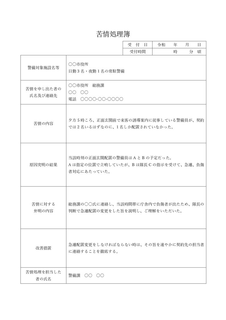 警備業法施行規則第66条第1項第8号では、警備業者は苦情処理簿を備え付けるよう定めています。