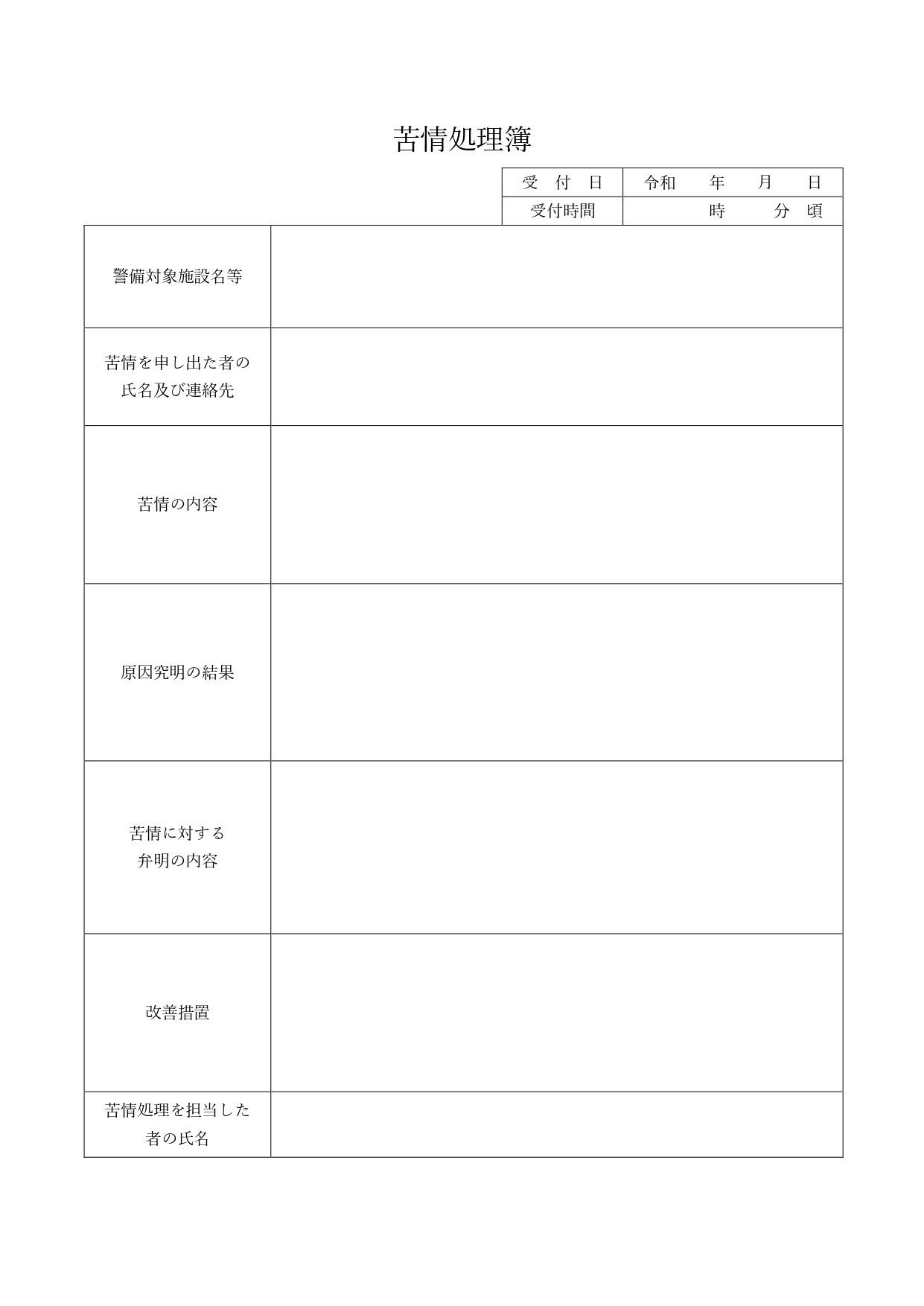苦情処理簿に関する書式に定められているものはありませんが、警備業協会が指導している書式というものがありますので、ご紹介させていただきます。